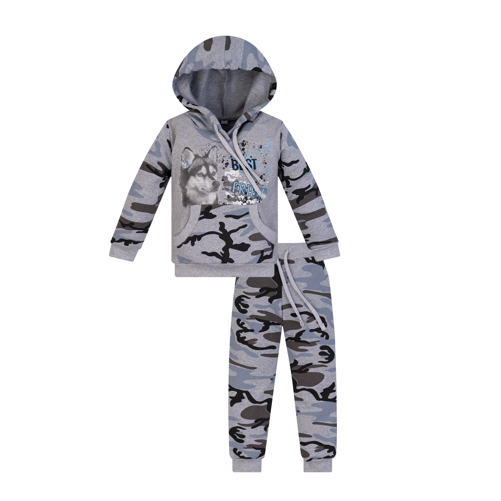 Костюм для мальчика. Камуфляж. Спортивный костюм для мальчика - удобный и качественный демисезонный наряд, состоит из брюк – джоггеров и кофты с капюшоном свободного кроя с принтом, цвет серый. Для производства данной модели использовался мягкий, легкий и приятный к телу футер 2-х нитка с лайкрой без начеса. Носить костюм всесезонный можно при любой погоде – холодным летом, теплой осенью, весной или зимой, под верхний слой одежды. Комплект прекрасно подойдёт для занятий физкультурой в школе, путешествий и повседневной носки. Костюм для мальчиков удобен на любую фигуру. Примечательно, что оба предмета при желании можно сочетать с прочей одеждой и носить по отдельности. Благодаря манжетам и резинкам на рукавах и штанинах комплект подходит для разной длины рук и ног. Костюм для мальчика— это отличный подарок на день рождения и другие праздники, такой презент будет ежедневно напоминать о вашей любви и заботе. Костюм детский прост в уходе - мы рекомендуем предварительную стирку при 30 градусах. Т.к. изделие включает в себя контрастные цвета, рекомендуем использовать порошки и гели для цветных вещей. Вы можете посмотреть весь ассортимент одежды нажав на логотип бренда Утенок. Собственное производство в РФ.