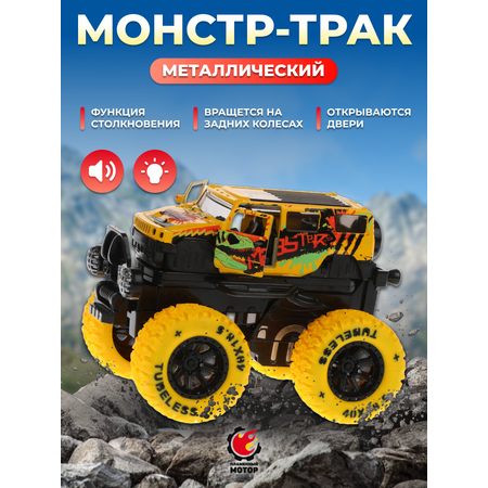 Игрушечная машинка «Монстр трак» обладает уникальными способностями! Она может подпрыгивать на стойках, а во время прыжка у неё «отлетает» кабина. В игрушке предусмотрен механизм движения pull back, который позволяет ей ездить самостоятельно, а также функция вращения на задних колёсах на 360 градусов. Двери салона открываются вручную. Машинка обладает светозвуковыми эффектами (звуковые активируются при столкновении авто с препятствиями). Свет и звук работают от 3-х батареек типа LR41 (входят в комплект). Размер машины (ДхШхВ): 10х7,5х10 см. Цвет машинки - желтый. Игрушка изготовлена из металла с элементами пластмассы.