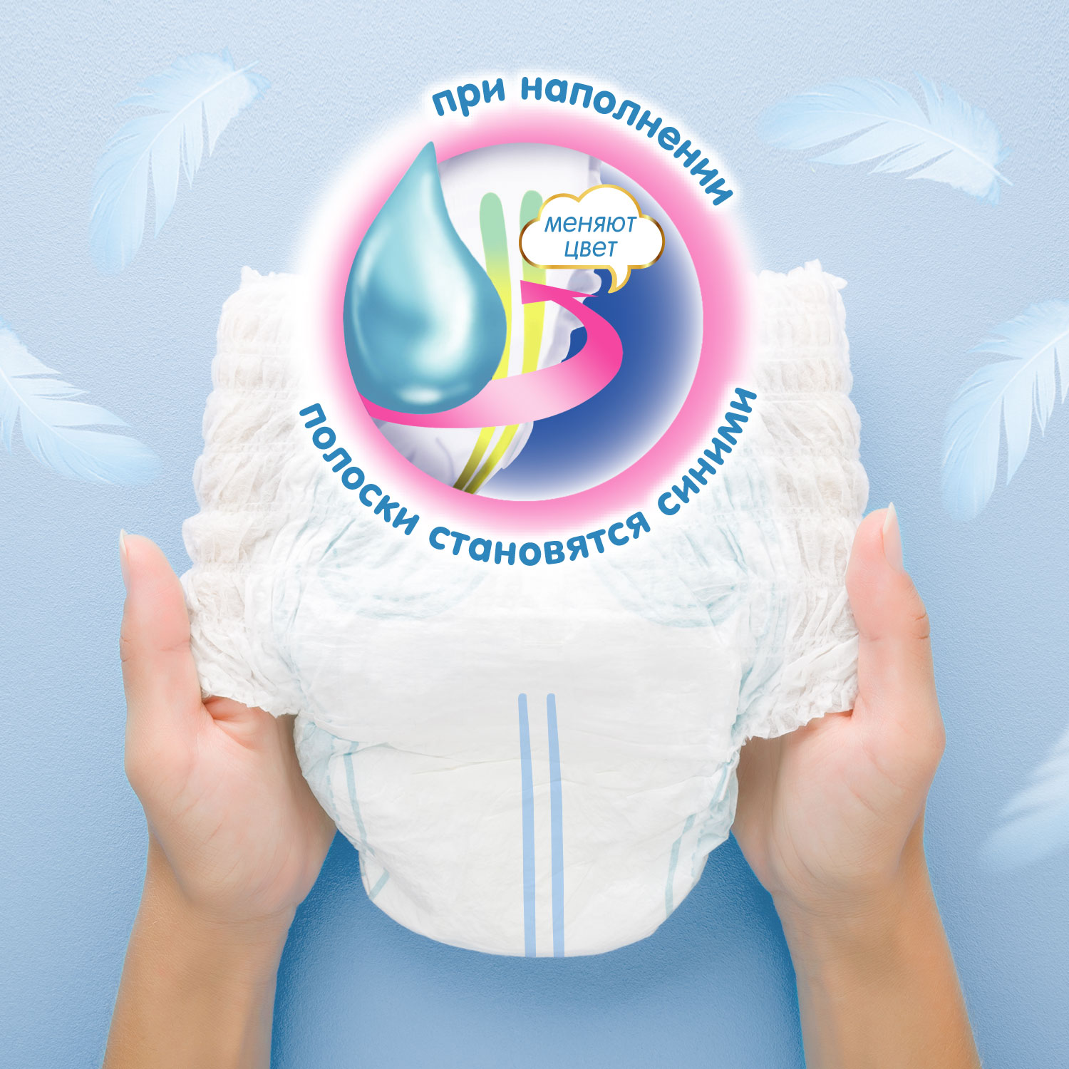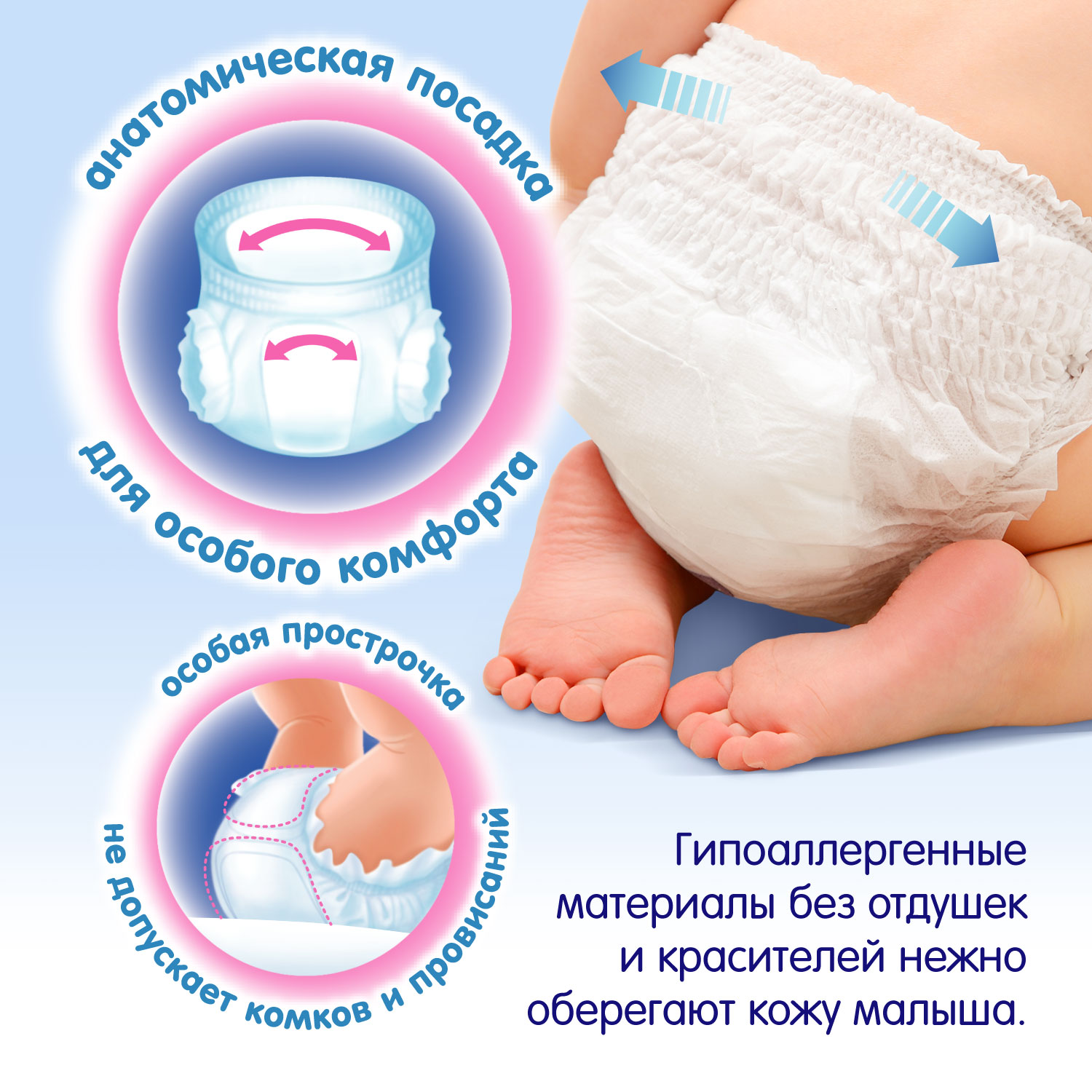 Улучшенная 4-слойная система впитывания Smart Absorb System надёжно запирает влагу и запах, защищая кожу от раздражений и позволяя ребёнку наслаждаться сухостью и комфортом. Продуманная конструкция трусиков обеспечивает правильную и надёжную посадку.