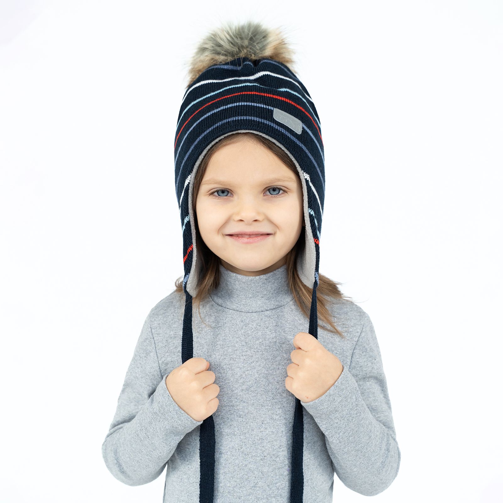 Особенности модели: практичная зимняя шапка для мальчика. Шапка на завязках для мальчика. Хорошо закрывает уши ребёнка от ветра. Завязывается лямками. На концах лямок фиксаторы. Украшена светоотражающая нашивка, меховой помпон. Выпускается в приятной гамме с рисунком из разноцветных полос.