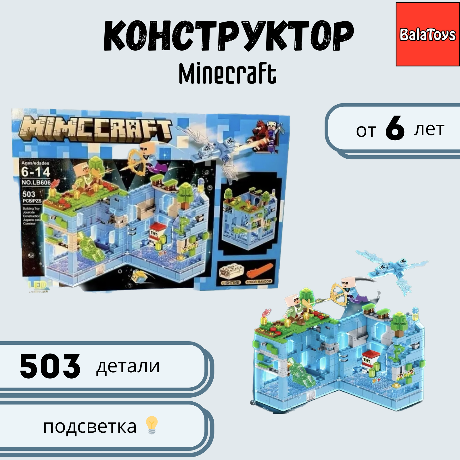 Конструктор Mimccraft No.Lb606 Состоит из 503 деталей, в комплекте которого есть как разноцветные, так и светящиеся элементы! Утрой настоящую Mimccraft дискотеку у себя дома! Создан по мотивам всемирно известной игры. В комплекте удобная инструкция. Весь набор выполнен из высококачественного и безопасного пластика ABS! Увлекательный процесс сборки перейдет в не менее увлекательную и уникальную сюжетную игровую линию! Отлично способствует развитию юных любителей игрушек и отвлечет их от экранов телефона на долгое время, а после станет отличным украшением вашего интерьера! Фанаты игры смогут своими руками воссоздать мир героев . На нашей странице представлены самые популярные линейки игры.Благодаря нашим конструкторам дети развивают свою моторику, воображение, отвлекаются от гаджетов. Некоторые модели конструкторов Mimccraft имеют светящиеся блоки, благодаря которым ребенку будет еще интереснее собирать игровой набор.