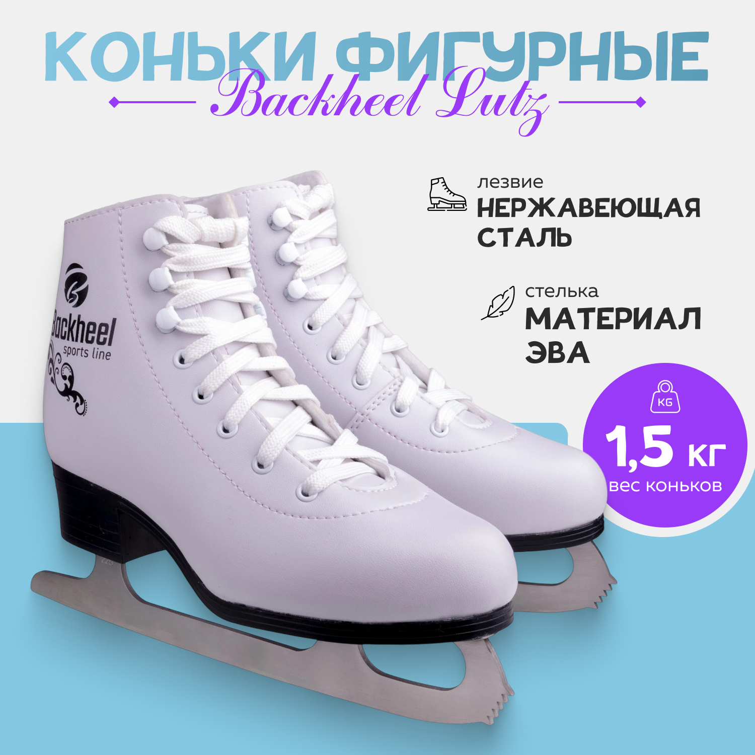 Классические коньки Backheel Lutz для фигурного катания, произведённые российской фабрикой спортивного инвентаря. Используется адаптированная российская колодка.