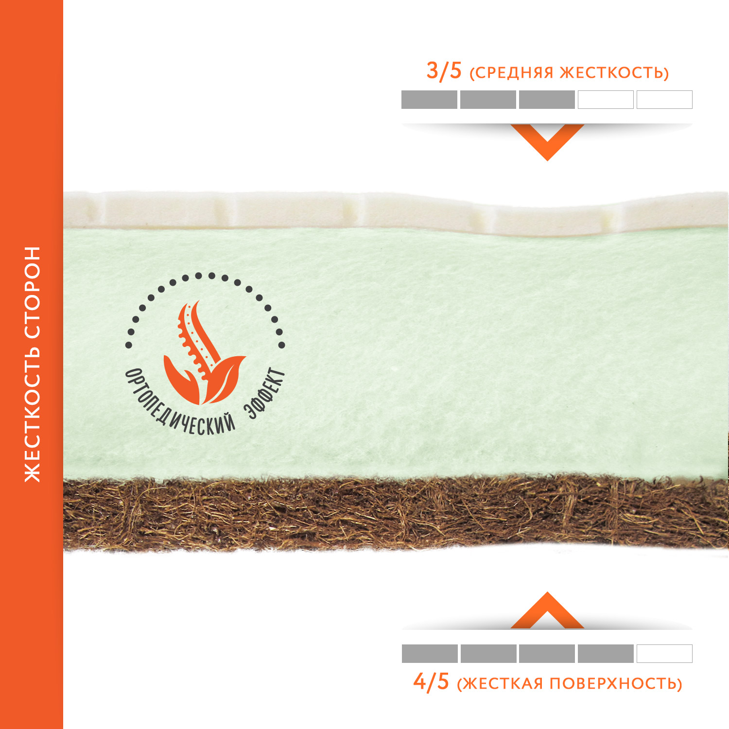 Жесткая сторона матраса с двойным слоем кокосовых волокон предназначена для сна новорожденного младенца. Кокосовая койра, скрепленная натуральным латексом, образует упругий, и в то же время очень эластичный материал, с прекрасной воздухопроходимостью, а двойной слой кокосовых волокон значительно повышает ортопедические свойства матраса.