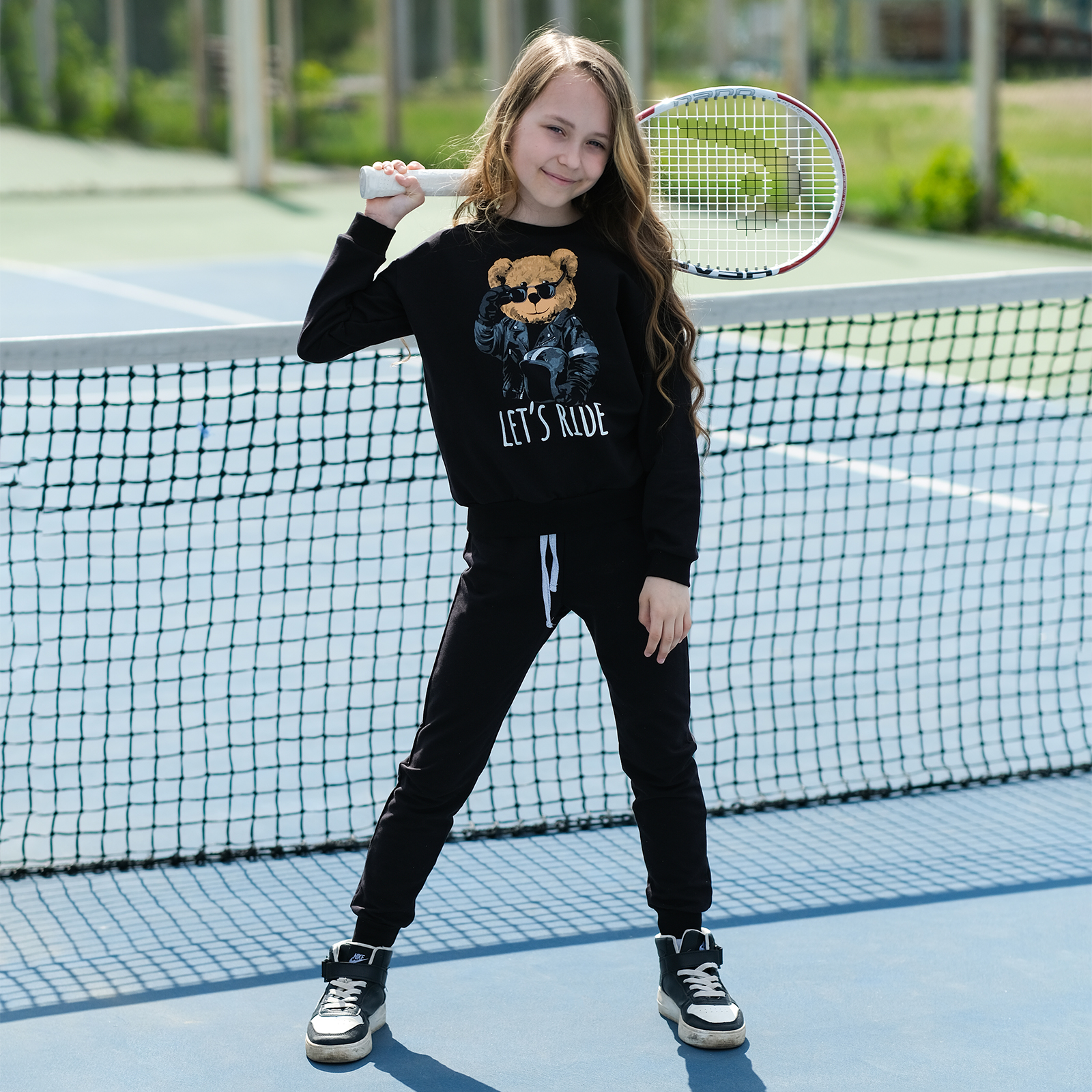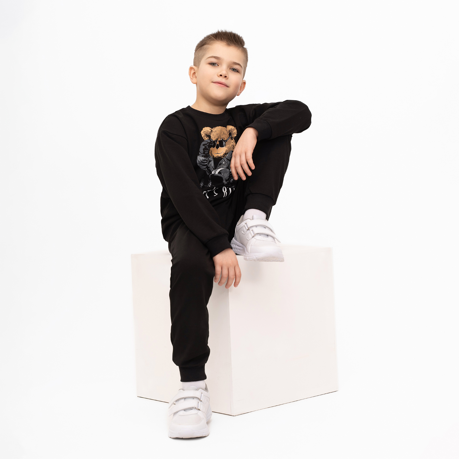 Особенности модели: Трикотажный костюм для детей. Брюки на широкой резинке в поясе и со шнурком для лучшей регулировки по размеру. По бокам карманы, сбоку декоративная бирка флажок. Джемпер с длинными рукавами. Горловина обработана эластичным кантом, сзади киперная лента от растягивания. Манжеты на рукавах и штанинах, низ джемпера из эластичного, мягкого трикотажа. Костюм выпускается в однотонном цвете, передняя сторона джемпера украшена стильным принтом.