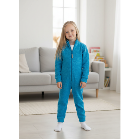 Особенности модели: флисовый комбинезон с прямой молнией-застёжкой, плоским слайдером и тканевым пуллером, на воротнике-стойке предусмотрен защитный клапан для бегунка молнии, чтобы не натирать подбородок. Двухслойные манжеты на рукавах и штанинах мягко фиксируют длину и защищают от продувания, сбоку вшит декоративный флажок, а однотонный цвет с приятным меланжевым эффектом делает модель универсальной и подходящей и для мальчика, и для девочки.