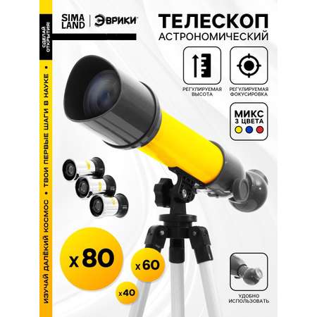 Ближе к звёздам! Малышу уже интересны ярко мерцающие точки на ночном небе? Пришло время подарить ребёнку личный телескоп! С функциональной игрушкой чадо почувствует себя астрономом и понаблюдает за далёкими звёздами и планетами. Перед школьником откроется необъятная Вселенная с множеством загадок и тайн. Состав телескопа: линза объектива; бленда; труба телескопа; переходная труба; окуляр; диагональное зеркало; фокусирующая трубка; регулирующий болт; штатив; крышка; регулятор угла наклона штатива. Разгадайте загадки Вселенной: поворачивайте телескоп на 360 градусов; рассмотрите ближайшую звезду благодаря степеням увеличения в 40, 60 и 80 раз. Для детей старше 8 лет.Цены в интернет-магазине могут отличаться от розничных магазинов.