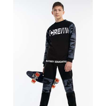 Смортивный костюм из комбинированного трикотажа, состоит из свитшота и джоггеров. Свитшот прямого кроя, круглый вырез горловины, длинный рукав с эластичным манжетом, с яркими текстовыми принтами на полочке и поясе. Джоггеры с боковыми карманами, цельнокройным поясом и манжетом с вшитой внутри резинкой, на передней половинке текстовый принт.