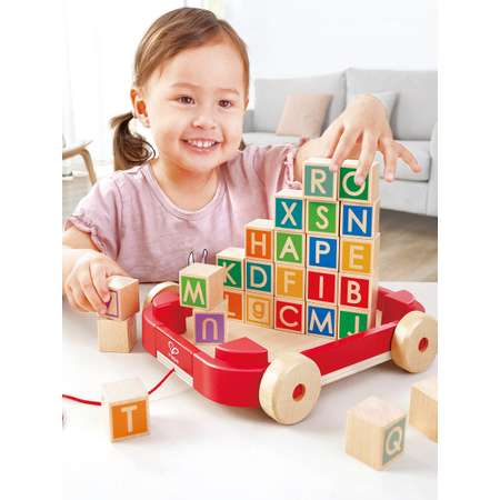 - Каталка-тележка HAPE с кубиками и английским алфавитом - это отличный подарок для ребенка, который начинает изучать английский язык.