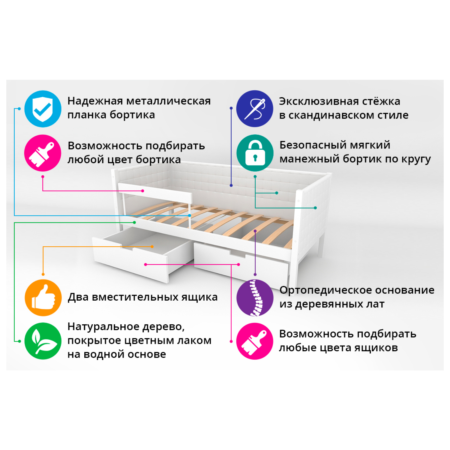 Комплект кровати состоит из каркаса кровати, мягких чехлов на бортики и ортопедического основания. Дополнительный бортик, ящики, матрас и постельные принадлежности приобретаются отдельно.