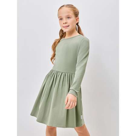 Базовое платье мини для девочек цвета хаки из хлопкового трикотажа. Гипоаллергенный, эластичный и воздухопроницаемый материал, который хорошо сохраняет свою форму при длительной носке. Отрезное по талии. Округлая горловина. Длинные рукава. Рост модели/размер одежды: 140 см