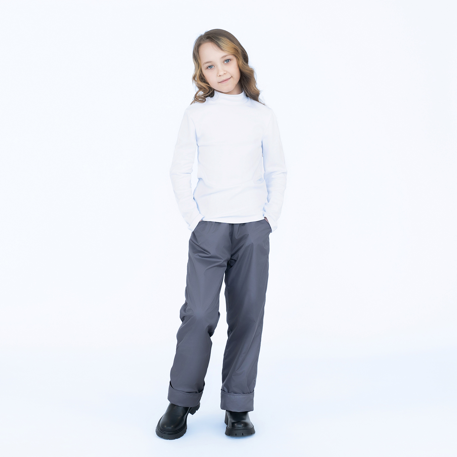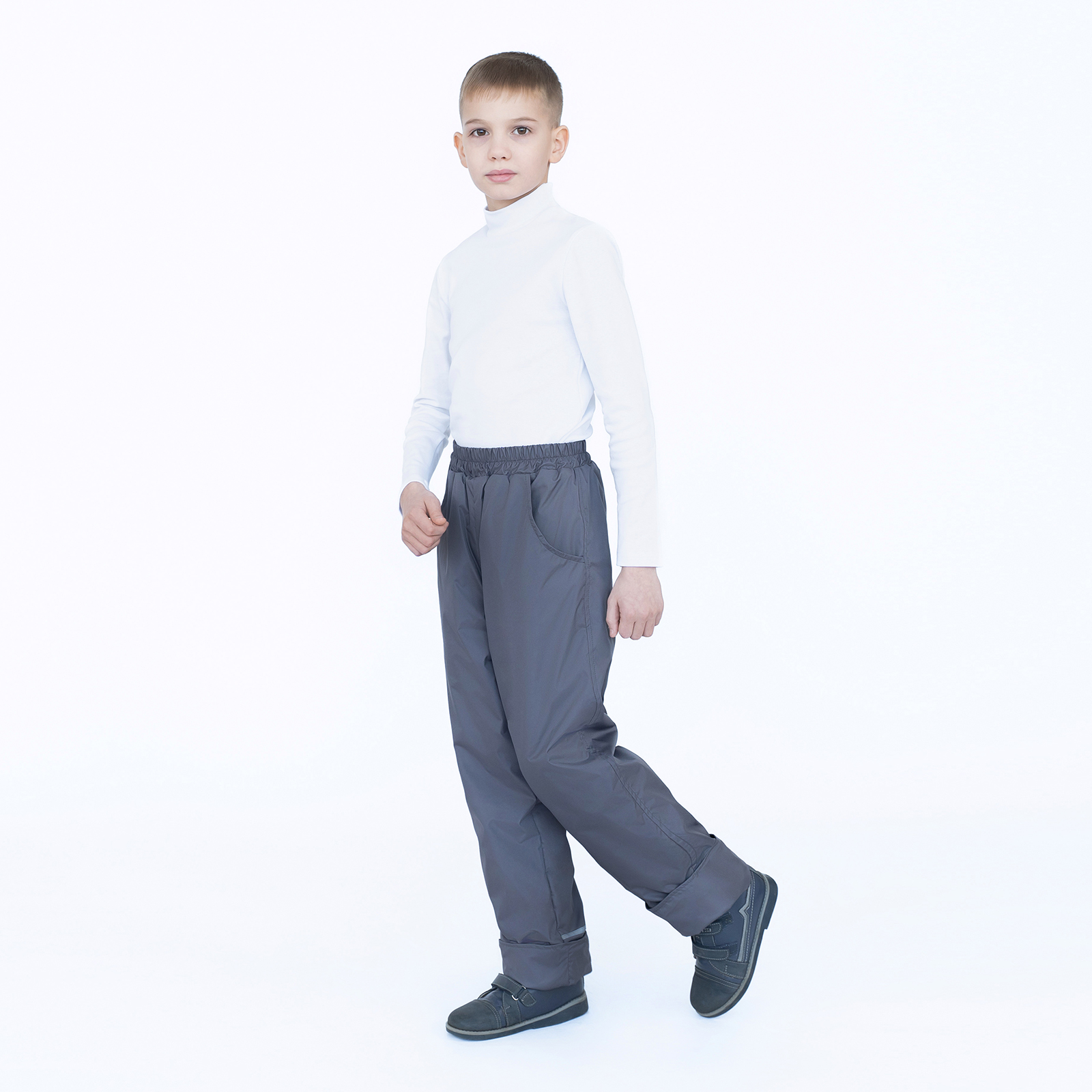 Особенности модели: Демисезонные детские брюки. Низ штанин можно подвернуть на нужную длину. На отворотах подклад без флиса. По бокам расположены небольшие кармашки, в пояс брюк вдета резинка. На правой штанине сзади есть светоотражающая полоса. Выпускаются брюки в однотонном цвете.