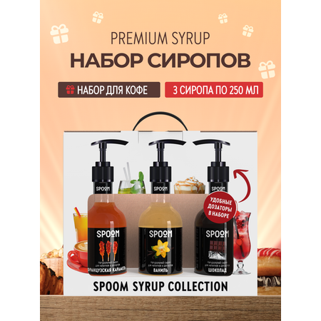 Набор сиропов Spoom для кофе в фирменной упаковке - это отличный формат подарка для себя и своих близких. Набор состоит из 3 бутылочек сиропов со вкусами Французская карамель, Ваниль и Шоколад , объемом 250 мл каждая. Также в подарочный набор входят 3 шт помпы-дозатора в подарок.