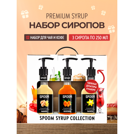 Набор сиропов Spoom для чая, десертов и выпечки в фирменной упаковке - это отличный формат подарка для себя и своих близких. Набор состоит из 3 бутылочек сиропов со вкусами Имбирь, Облепиха, Ваниль, объемом 250 мл каждая. Также в подарочный набор входят 3 шт помпы-дозатора в подарок.