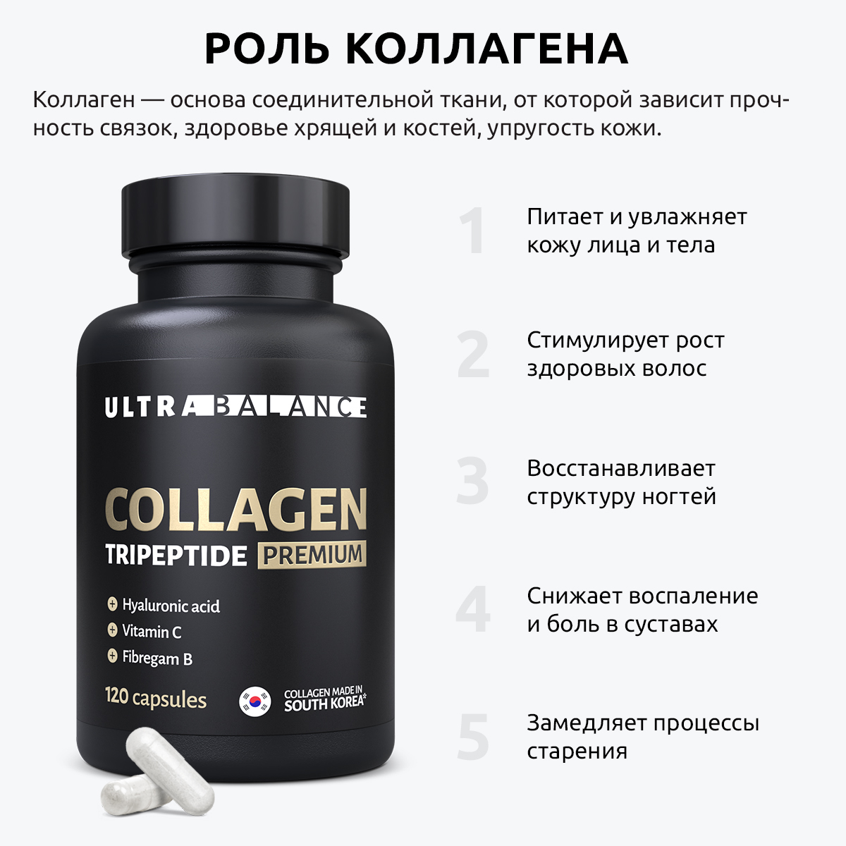 Collagen Tripeptide Premium 120 капсул от компании Ultra Balance производится из высококачественного морского низкомолекулярного трипептид коллагена из Кореи. С гиалуроновой кислотой, витамином С и фибрегам В.