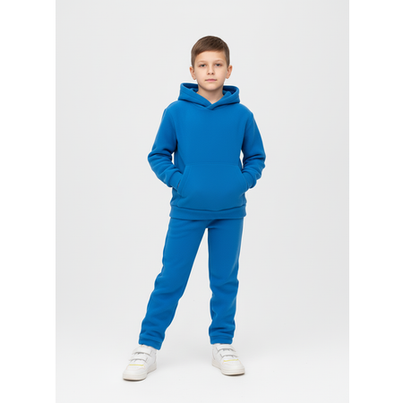 Особенности модели: детский флисовый костюм. Брюки на резинке в поясе, манжеты на штанинах. Толстовка с капюшоном и с карманом-кенгуру. Низ и рукава на манжете. Костюм сшит в однотонном цвете. Поддева под зимний комбинезон.