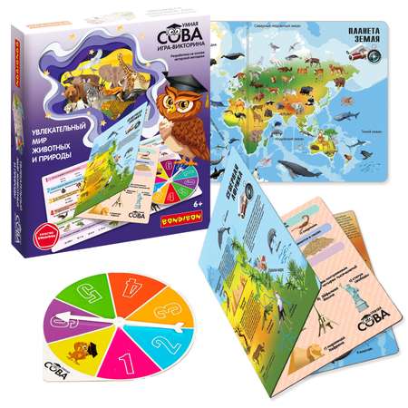 Игра викторина Увлекательный мир животных и природы из серии Умная Сова от Bondibon — это уникальный развивающий игровой набор, способствующий познавательному развитию и расширению кругозора у детей. Развивашка отличный способ научить детей усваивать знания в игровой форме. Это не просто полезное развлечение, а настоящий тренажер для развития эрудиции и интеллекта ребенка, который познакомит с интересными животными планеты, с картой Земли, и поможет ориентироваться в материках, как на глобусе. Поиск ответов на тематические вопросы способствует развитию логики, памяти, усидчивости и внимания. Настольная игра – прекрасный подарок мальчику и девочке на день рождения, Новый год или 1 сентября. А также полезный сюрприз на выпускной в детский сад или школу. Выберите часть суши и отправляйтесь в путешествие. Рассмотрите всё, что изображено на карточке. Далее переверните карточку. На обороте есть вопросы. Раскрутите рулетку и прочтите тот по счету вопрос, номер которого выпал на ней. Отвечайте, не подсматривая изображение на лицевой стороне карточки. В комплект входят: 10 двусторонних карточек из твёрдого картона, рулетка. Песочные часы в данной викторине отсутствуют, но можно усложнить игру, играя на время. Предназначен детям от 6 лет. Умные развивалки подобного рода особенно полезны для детей, как отличное пособие и методический материал для тренировки iq мозга и подготовке к школе. Обучающий набор соответствует ФОП и ФГОС и рекомендован методистами и педагогами: развивает социально-коммуникативные и познавательные навыки и знакомит с миром природы. Дидактический набор подходит школьникам, дошкольникам для занятий дома на каникулах или в детском садике или классе. Обучающие настольные игры такого типа пользуются популярностью за счет их пользы и увлеченности. В коллекции товаров от Бондибон представлены детские обучающие игрушки для девочек и мальчиков, крутые интересные настолки для компании, популярные развивашки для всей семьи!