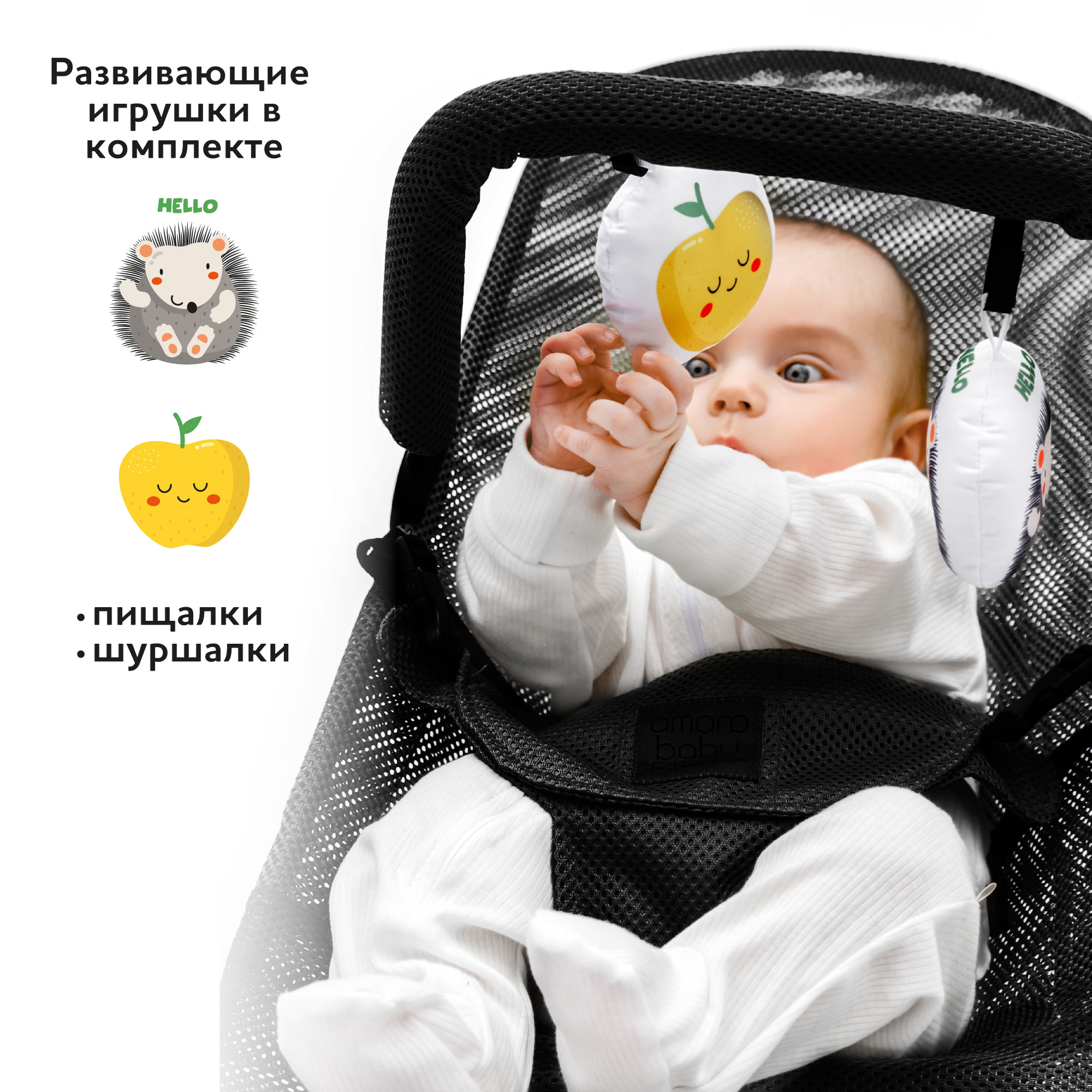 У шезлонга имеется дуга с двумя шуршащими игрушками, что позволяет развивать моторику ребенка.