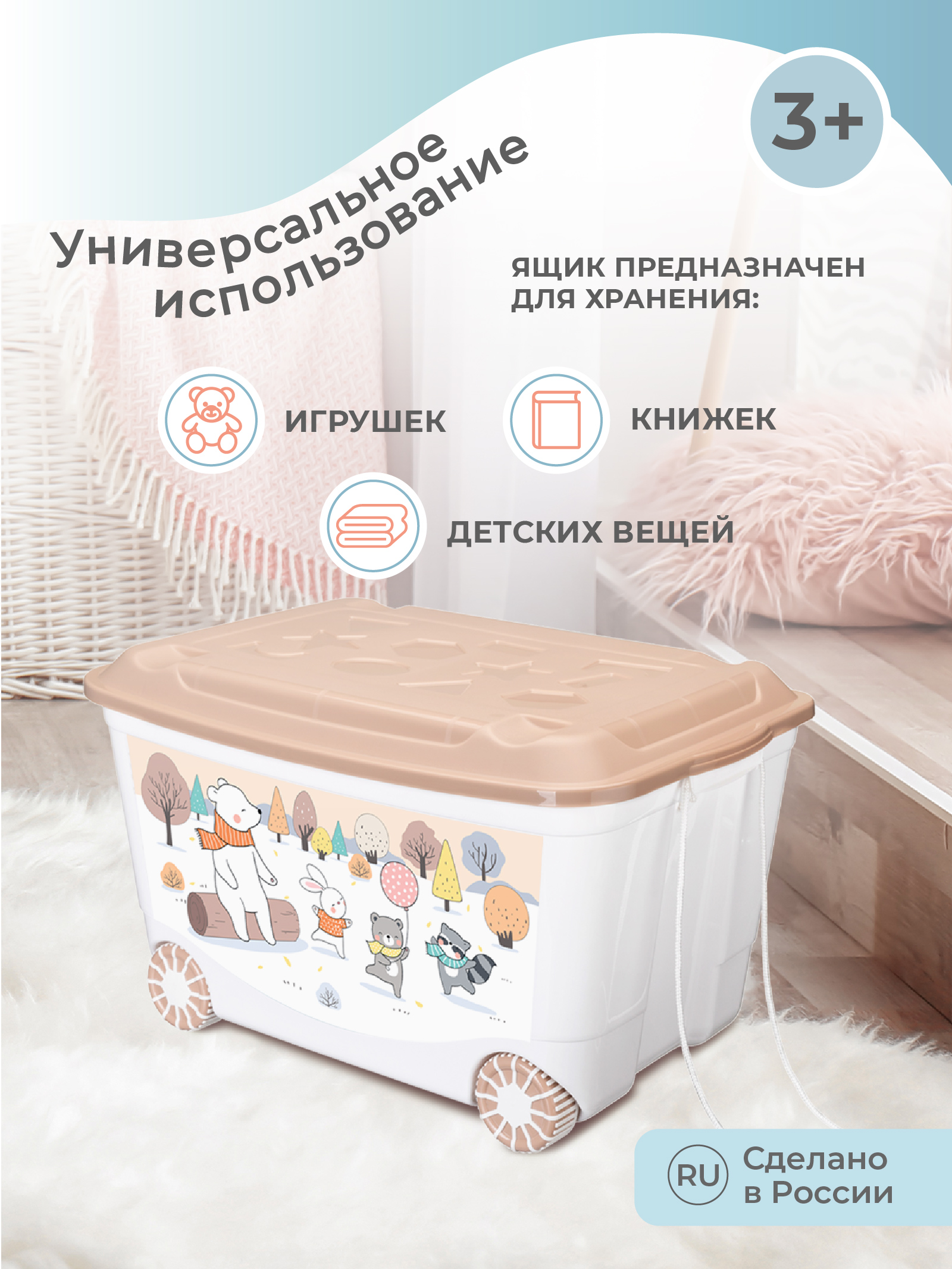 Ящик для игрушек Пластишка на колесах с декором Зверушки на опушке 45л темно-бежевый