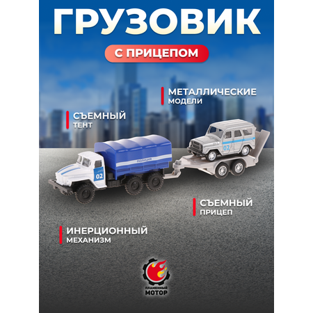 У грузовика съемные тент и прицеп с подвижной платформой для съезда и заезда машин. Размеры грузовика 12х4,5х5 см, а вместе с прицепом – 26,5х4,5х5 см. Минимашина имеет компактные габариты 7,5х3,5х3,5 см. Такие железные игрушки в упаковке отлично подойдут для детей 3, 4, 5, 6, 7 лет и станут замечательным подарком на 23 февраля или к школе первокласснику.