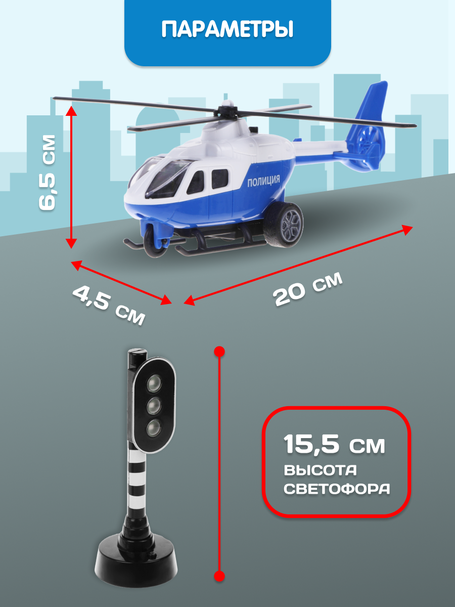 Размер вертолета (ДхШхВ): 20х4,5х6,5 см, высота светофора: 15,5 см.