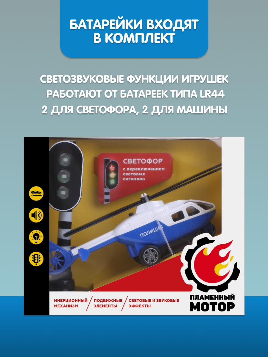 Светозвуковые функции игрушек работают от 4-х батареек типа LR44 (2 для вертолета, 2 для светофора). Элементы питания входят в комплект. Перед игрой необходимо убрать пластиковые блокираторы из отсеков для батареек.