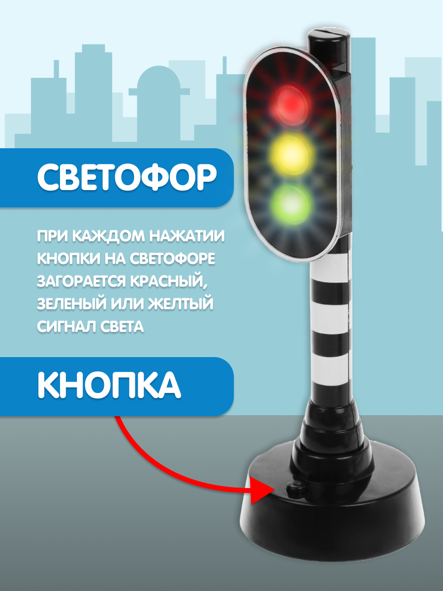 В комплекте прилагается светофор. При каждом нажатии кнопки на нем загорается красный, зеленый или желтый свет.