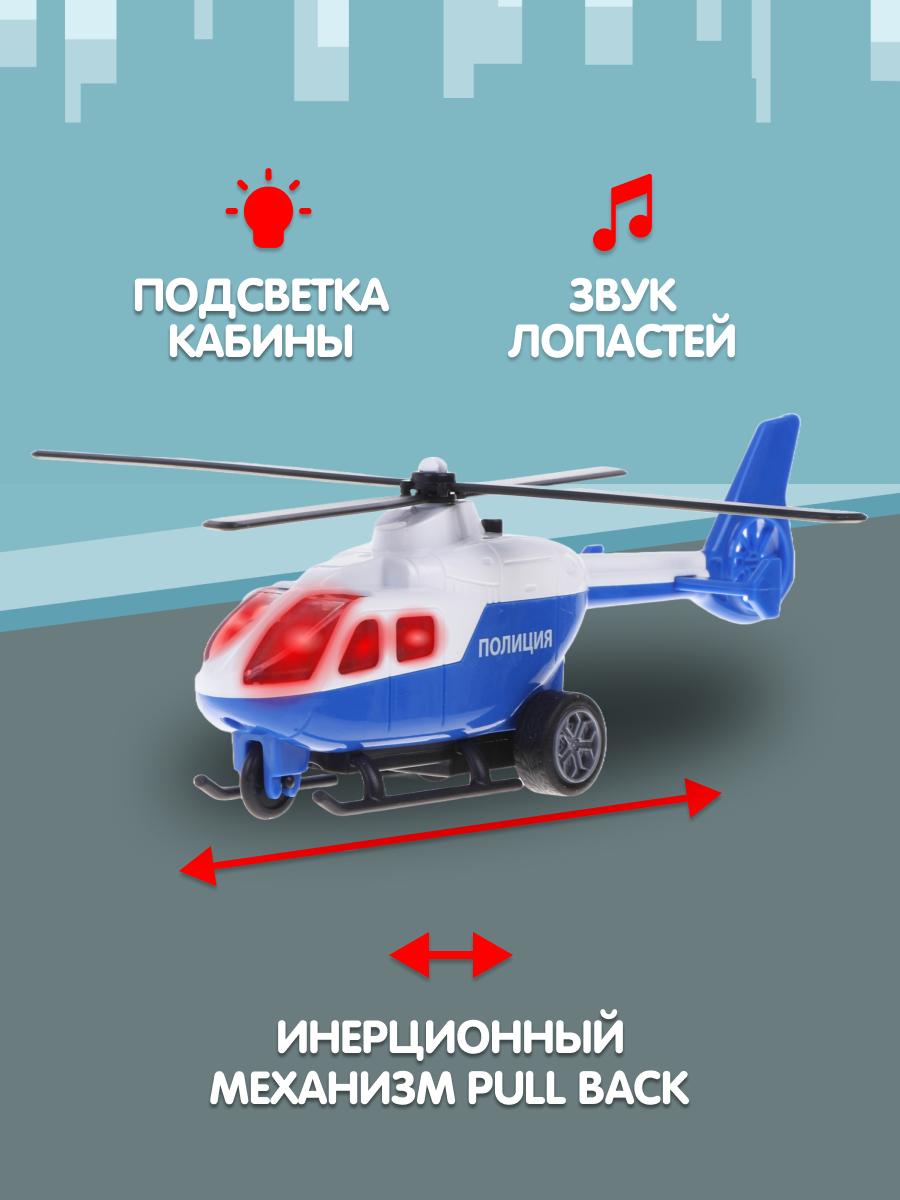 Уменьшенная версия полицейского вертолета отличается тщательной проработкой деталей. Лопасти можно вращать. В игрушке есть инерционный механизм движения – pull back. Чтобы отправить вертолет в самостоятельное путешествие, нужно сперва откатить его назад, на небольшое расстояние, а затем отпустить.