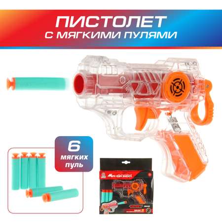 В комплекте игрушечный пистолет и 6 мягких снарядов.