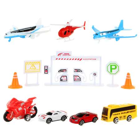 В комплекте 2 машинки, игрушка автобус, заправка, игрушка мотоцикл, 2 самолета, игрушка вертолет, 2 дорожных знака, 2 конуса, коврик из картона.