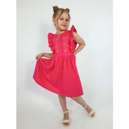 Трикотажное платье с рюшами от бренда Luneva – идеальный выбор для стильных и элегантных девочек. Нарядное яркое платье подойдет как для торжественных мероприятий, так и для повседневной носки. Данная модель выполнена из 100% хлопка, который является гипоаллергенным материалом, что особенно важно для нежной кожи ребенка. Свободный крой длиной до колена гарантирует удобство движений, а пуговицы придают изделию, не только изысканный вид, но и обеспечивают удобство снятия и одевания. Такой фасон подойдет как на высокий, так и на маленький рост. Стильное праздничное платье с цветочной вышивкой подойдет как для утренника, так и для выпускного в саду или фотосессии. Базовое летнее платьице с воланами станет оригинальным подарком для дочки или внучки на день рождения или любой другой праздник. Для того чтобы изделие радовало Вашего ребенка дольше, мы рекомендуем деликатную стирку при t не более 30С с использованием смягчающих средств. Носите с удовольствием, будем рады вашим отзывам.