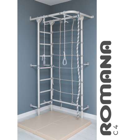 У домашнего спортивного комплекса ROMANA С4 оригинальная конструкция и расположение элементов. На рукоходе можно разместить разнообразное навесное оборудование. В комплекте предусмотрены канат, кольца и канатный лаз шириной 80 см из крепкого шнура. Конструкция выдерживает вес до 100 кг (нагрузка при испытаниях — 200 кг). Ступени лестницы обладают массажным эффектом, развивая мелкую моторику.