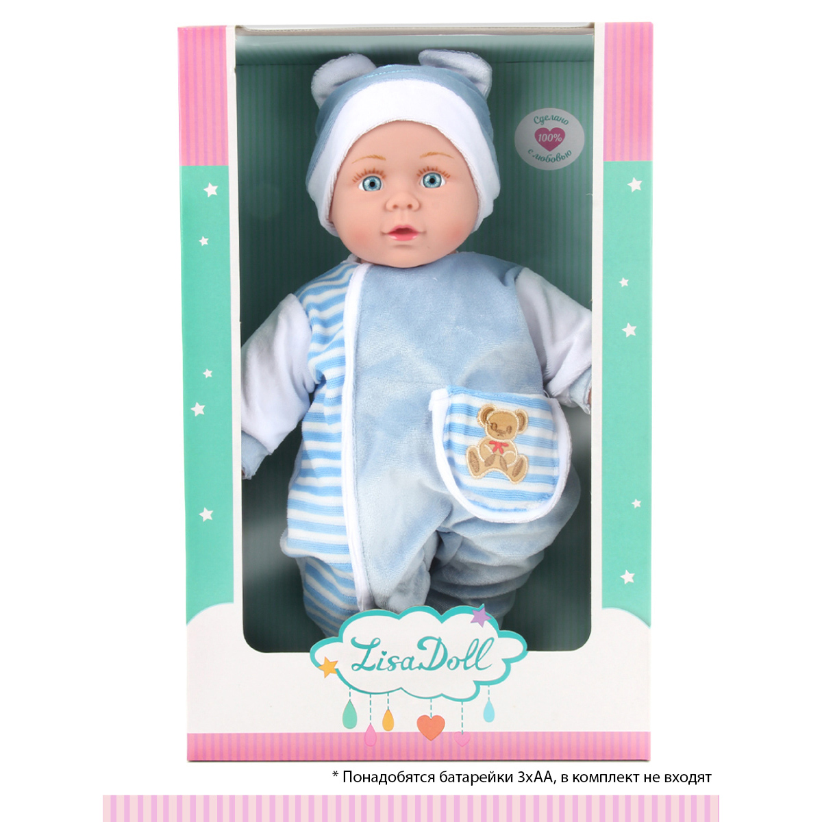 Совсем, как настоящий, очень милый и очаровательный пупс порадует любую девочку! С ним так здорово играть: он знает много фраз, умеет рассказывать веселые стихи, поет колыбельную, стоит нажать на одну из ручек! Пупсик одет в стильный и мягкий комбинезончик, шапочку с ушками и забавной мордочкой, носочки. Тело пупсика мягконабивное, кисти ручек и стопы ножек сделаны из пластмассы. Бровки, реснички нарисованы, глазки не закрываются, ручки, ножки, голова мягкие. Забота о такой кукле научит ребенка ответственности, улучшит коммуникативные и социальные навыки, позволит придумать множество сюжетно-ролевых игр, развивая фантазию!