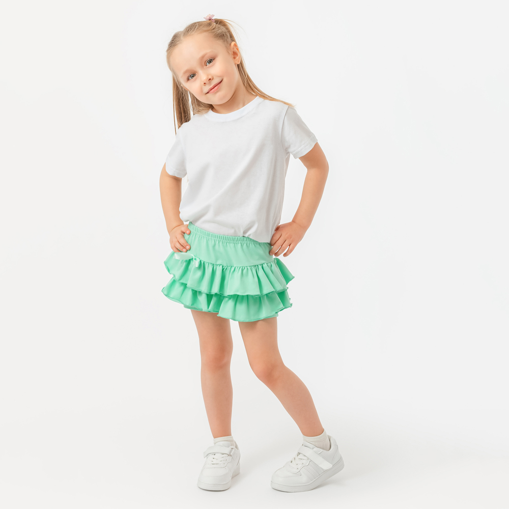 Шорты-юбка для девочки изготовлены из трикотажа премиум качества - кулирка. Шорты-юбка для девочки украшены широкой оборкой в два ряда и атласным бантиком на поясе.