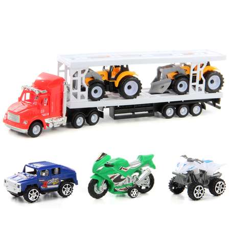 В комплект входят тягач с платформой, 2 трактора, джип, мотоцикл и багги. Машинки катаются вперед-назад.