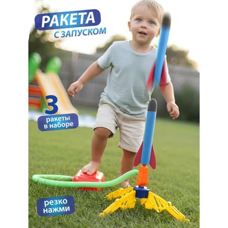 Пусковая установка с ракетой легко собирается и разбирается. При нажатии на педаль происходит выстрел, угол запуска летательного аппарата регулируется.
