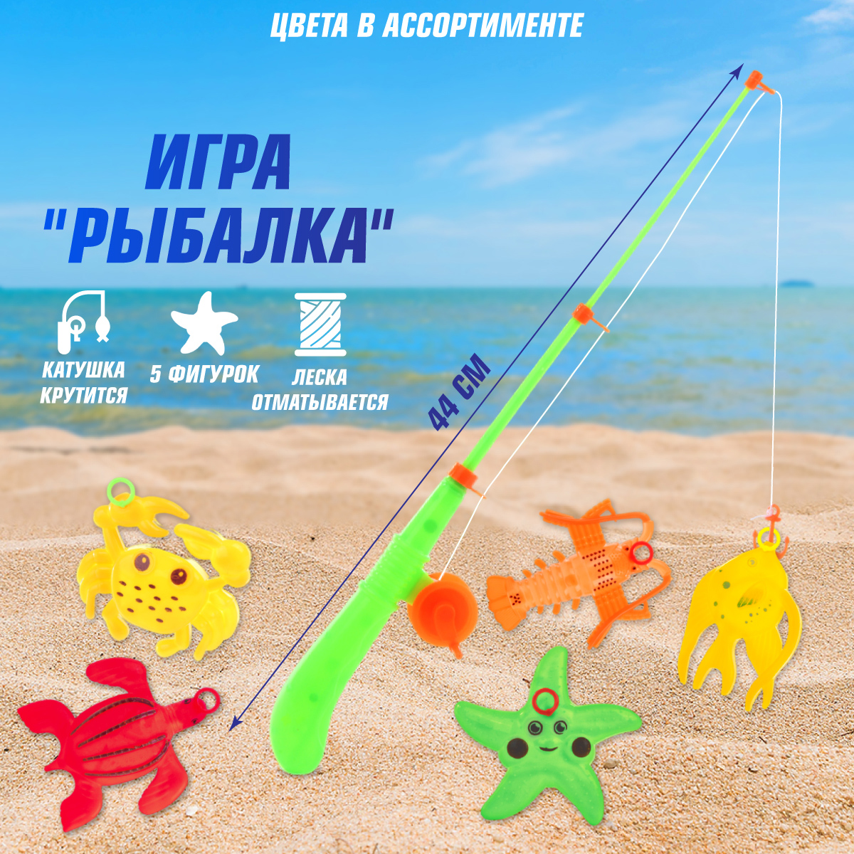 В комплект входят удочка и фигурки морских обитателей. На фигурках есть колечки, с помощью крючка на удочке морских обитателей можно ловить за эти колечки. Леска отматывается, катушка крутится.