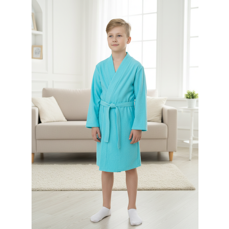 Детский халат из лёгкой односторонней махры — удобный халат для мальчика, который идеально подойдёт как домашний банный халат и как тонкий халат в бассейн благодаря лёгкой, хорошо впитывающей влагу ткани.