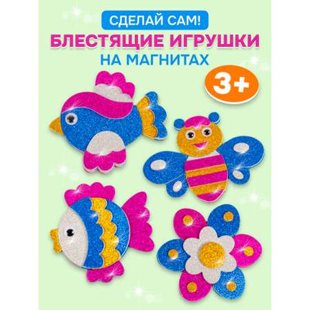 Перед вами набор для творчества, с помощью которого ребёнок самостоятельно сделает четыре яркие и необычные поделки – игрушки на магнитах. Это аппликация из современного объёмного полимерного материала ЭВА - безопасного, экологически чистого, не вызывающего аллергии, простого в использовании и приятного на ощупь. Фигурки из картона нужно украсить блестящими деталями. Набор особенно понравится девочкам. Все детали аппликации уже вырезаны и готовы к работе. Снимите с защитного слоя фрагмент и приклейте его в соответствующее место на фигурке. К готовой игрушке приклейте глазки, на обратную сторону наклейте магнит. Поделка будет хорошо держаться на холодильнике или магнитной доске. В наборе: 4 фигурки из картона, детали из мягкого блестящего пластика ЭВА на самоклеящейся основе, пластмассовые глазки, магнит.