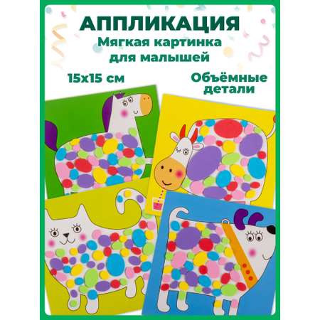 Аппликация – это интересное и полезное занятие для детей разного возраста. В нашем наборе вы найдёте всё для создания замечательной поделки. Клей и ножницы не понадобятся, детали аппликации на самоклеящейся основе уже вырезаны и готовы к работе. Особенность набора в том, что на картинках не обозначены специальные места для приклеивания деталей, ребенок может украсить кошку, собачку, лошадку и корову как захочет сам. Мы сделали детали крупными специально для детских ручек, чтобы малыш обязательно справился с работой. Яркая и выразительная аппликация с простыми и весёлыми картинками понравится девочкам и мальчикам.