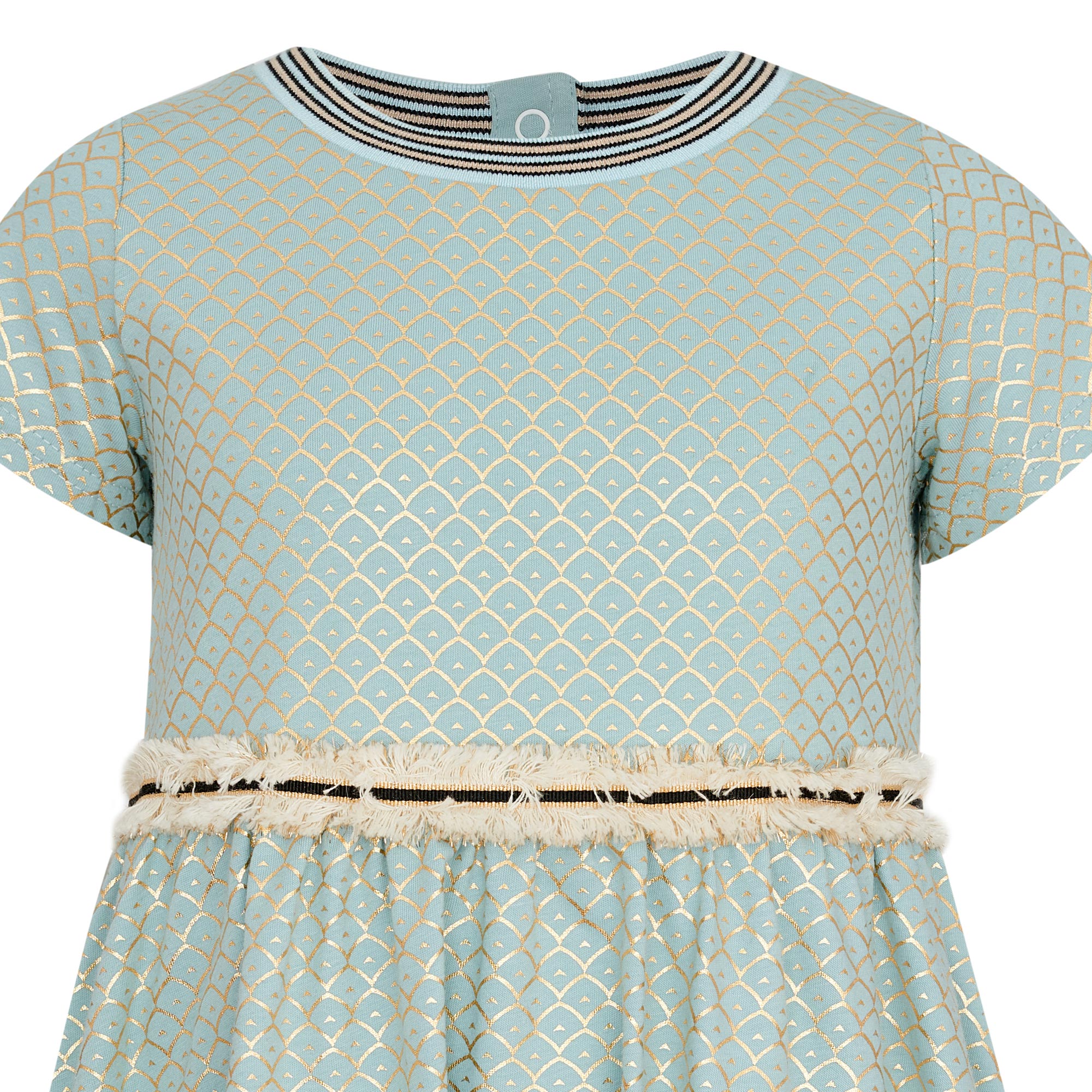 Очаровательное платье для девочки изготовлено из смесовой трикотажной ткани на основе натурального хлопка. Модель с пышной юбкой оценит любая маленькая модница. Нежный цвет мяты в сочетании с золотистым фантазийным принтом сделали платье нарядным. Линия талии оформлена контрастной тесьмой с бахромой. Круглый вырез горловины обработан трикотажной вставкой, которая препятствует натиранию нежной кожи ребенка.