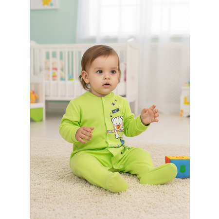 Особенности модели: комбинезон с закрытыми ножками и длинными рукавами, застёжки‑кнопки спереди для удобного переодевания, небольшой воротничок‑стойка и манжеты на рукавах для комфортной посадки и защиты от задирания рукава.