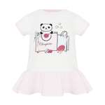 Чудесное платье для девочки с заниженной линией талии. Изделие представляет собой футболку, по низу которой пришита широкая присборенная юбка розового оттенка. Эксклюзивный наряд выполнен из качественного хлопкового трикотажа. Короткие рукава и ворот отделаны тесьмой. На полочке − оригинальный декор с забавным медвежонком. Стильный наряд для прогулки в теплое время года.