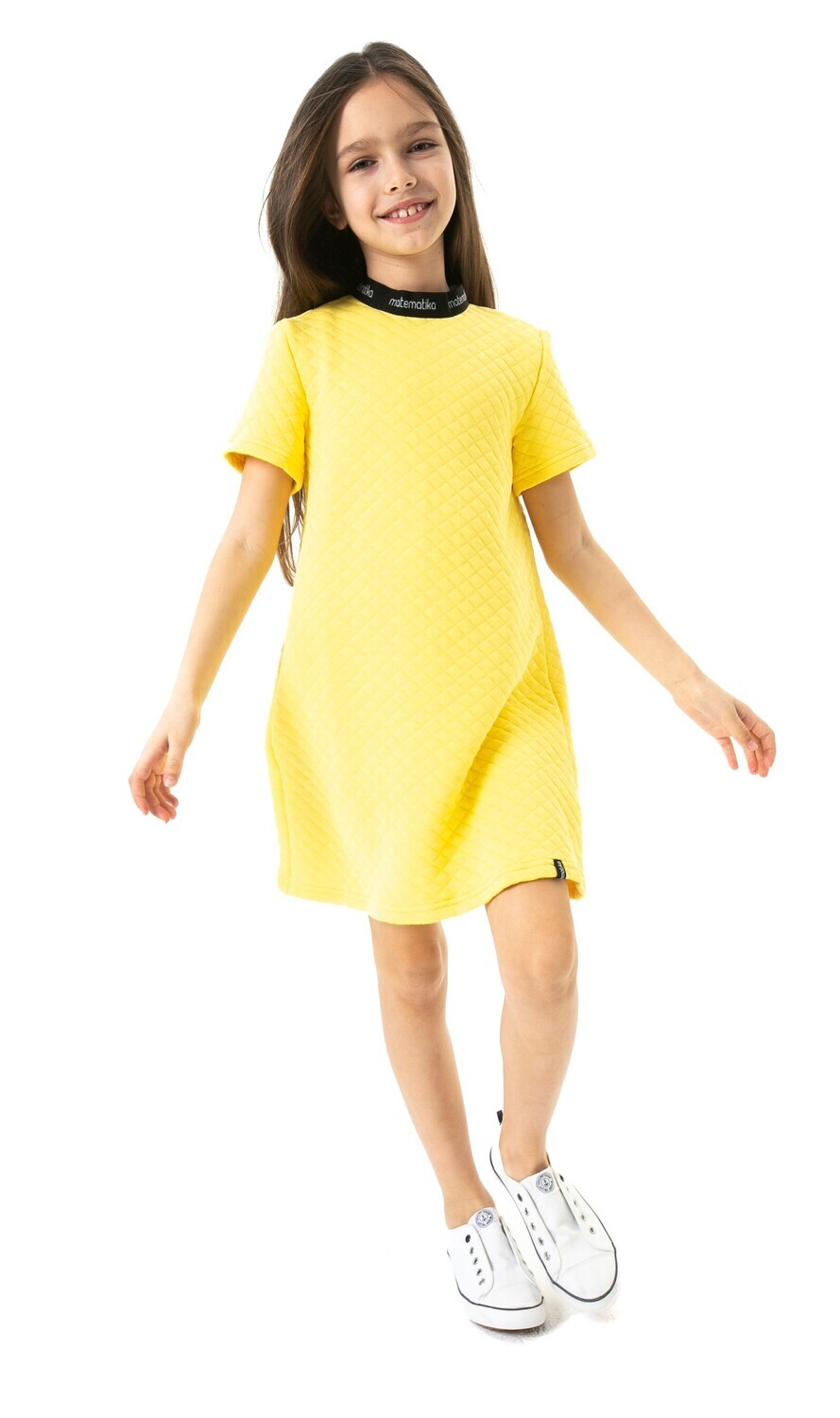 В этом платье доминирует один из основных цветов коллекции – лимонно-желтый. Он отлично оттеняет элегантную простоту кроя и лаконичность фактуры. Украшает фасон модный акцент – воротник из тесьмы-резинки. Благодаря свободному силуэту модель приятно прилегает к телу и отлично держит форму. Чтобы создать оригинальный образ, можно сочетать его с любыми леггинсами из коллекции «Рор star».