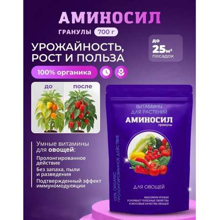 Витамины для овощей и рассады Аминосил в гранулах идеально подходят в качестве обогащения питания и стимулирования развития всех видов овощей (томатов и огурцов, картошки и кабачков, перцев и помидор, лука, капусты и прочих). Применяется на всех этапах жизни растения: рассада, вегетация, формирование завязей и созревания плодов. Витамины для овощей и рассады Аминосил в гранулах обеспечивают приживаемость рассады; повышают сопротивляемость болезням и вредителям; улучшают защитные свойства в периоды засухи и заморозков; обеспечивает активный рост и обильное плодоношение; усиливают полезные свойства и вкусовые качества овощей; улучшают состав почвы и способствует лучшей абсорбции питательных веществ, что значительно повышает качество и количество урожая; 100% органика - безопасны для людей и животных.