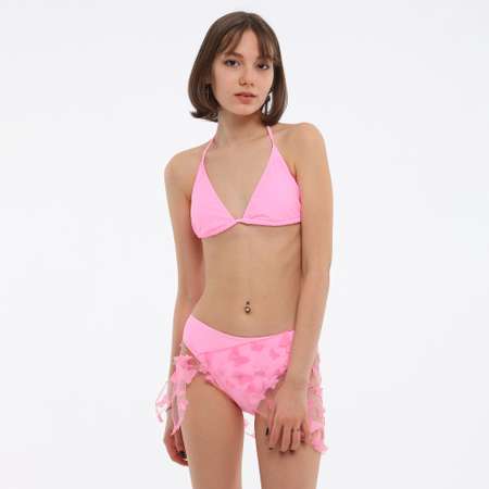 Модель выполнена из быстросохнущего эластичного материала Раздельный купальник. Лиф с треугольными чашечками и завязками на шее и на спине. Есть подкладка. В комплекте поролоновые вкладыши. Классические плавки с подкладкой спереди. В комплекте косынка из сетчатой ткани с аппликациями в виде бабочек.