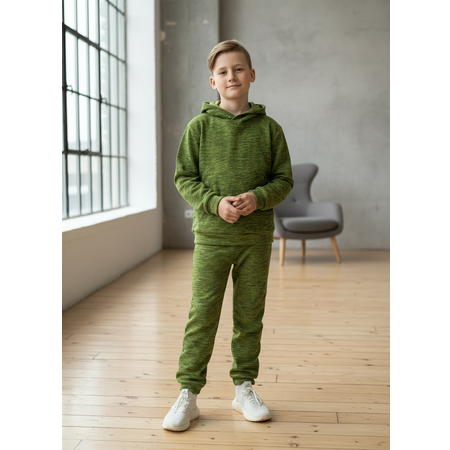Брюки на широкой резинке в поясе с возможностью регулировки размера через отверстие, низ штанин на манжетах для лучшей фиксации. Толстовка с глубоким капюшоном и карманом‑кенгуру спереди, низ и рукава на манжетах, в боковом шве — декоративный флажок с надписью; костюм сшит в однотонном цвете с меланжевым эффектом и выглядит стильно и аккуратно.