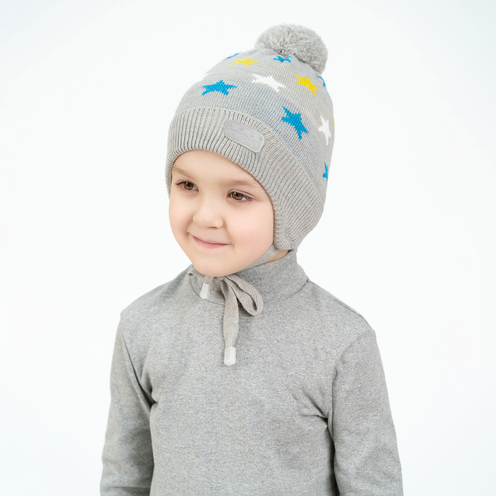 Шапка для мальчика на завязках. Состав: 30% меринос + 70% акрил.