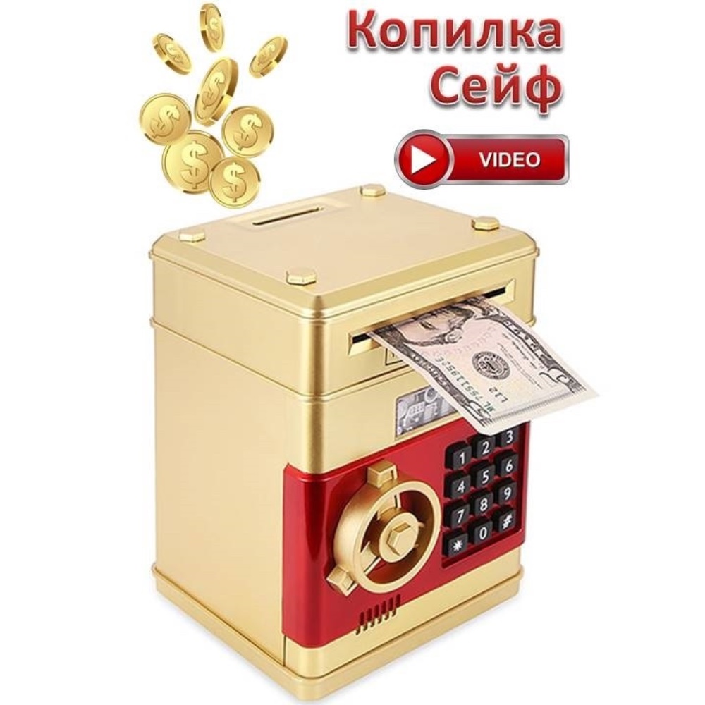 Копилка детская - это маленький сейф с кодовым замком, отличный подарок детям и взрослым. Работает на батарейках, принимает монеты и купюры. Подойдёт в качестве подарка на День Рождения, Новый год, 23 февраля, 1 сентября, юбилей, 8 марта. Данная копилка-сейф оснащена специальным механизмом, который срабатывает при поднесении купюры к купюроприемнику и затягивает ее внутрь, помещая в основное отделение копилки. В верхней части есть прорезь для монет. Как и положено настоящему сейфу, эта копилка имеет кодовый замок.Перед началом использования нужно открыть дверцу вводом кода 0000, дождаться , пока светодиод погаснет, потом нажать и удерживать кнопку * 10 секунд, далее ввести новый 4-значный код и нажать #, после чего отпустить кнопку *. Нужно сразу проверить, открывается ли копилка с новым кодом.Копилка-сейф оснащена механизмом, который при поднесении купюр затягивает их в сейф, как настоящий банкомат. Копилка открывается только при наборе кода, который вы заранее установите. Наберите числовой код, дождитесь, пока загорится зеленый индикатор, и поверните ручку. Вот сейф и открылся. Копилка- сейф оснащена самой настоящей системой безопасности: незакрытая дверца сигналит, напоминая о себе. Если Вы забыли код,то для этого достаточно вынуть батарейки на несколько минут — это восстановит заводской код «0000». Питание: 3 батарейки типа «AA» (не входят в комплект) Чтобы ее открыть, нужно ввести 4-значный цифровой пароль (настоящий пароль "0000"), затем прокрутить колесо и открыть дверь. При этом на дисплее загорится зеленая лампочка, которая будет гореть в течение 10 секунд, и будет воспроизводится скрипучий звук. Когда вы закончите, закройте дверь, чтобы заблокировать сейф.Копилка оснащена звуковым сопровождением. Когда вы вводите пароль, голос на английском языке говорит: "Password please" ("Пожалуйста, введите пароль"). Если вы ввели неверный пароль, на дисплее загорается красная лампа и голос говорит: "Oh, please try again" ("Пожалуйста, попробуйте еще раз"). Если дверь открыта больше 10 секунд, зеленая лампа перестает гореть, и включается сирена, которая воспроизводится каждые 20 секунд.