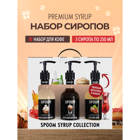 Набор сиропов Spoom в фирменной подарочной упаковке - это отличный подарок для себя и своих близких. Подарочный набор состоит из 3 бутылочек сиропов, объемом 250 мл каждая. Также в набор входят 3 шт помпы-дозатора в подарок. Сиропы прекрасно подходят для кофе, чая, коктейлей, лимонадов, десертов и выпечки, напиток или еда станут вкуснее и ароматнее. Набор сиропов станет прекрасным подарком на любой праздник, будь то свадьба, день рождения или новый год. Вы можете сделать подарок подруге, парню или маме, так как он понравится и мужчине и женщине, вкусняшки любят все.