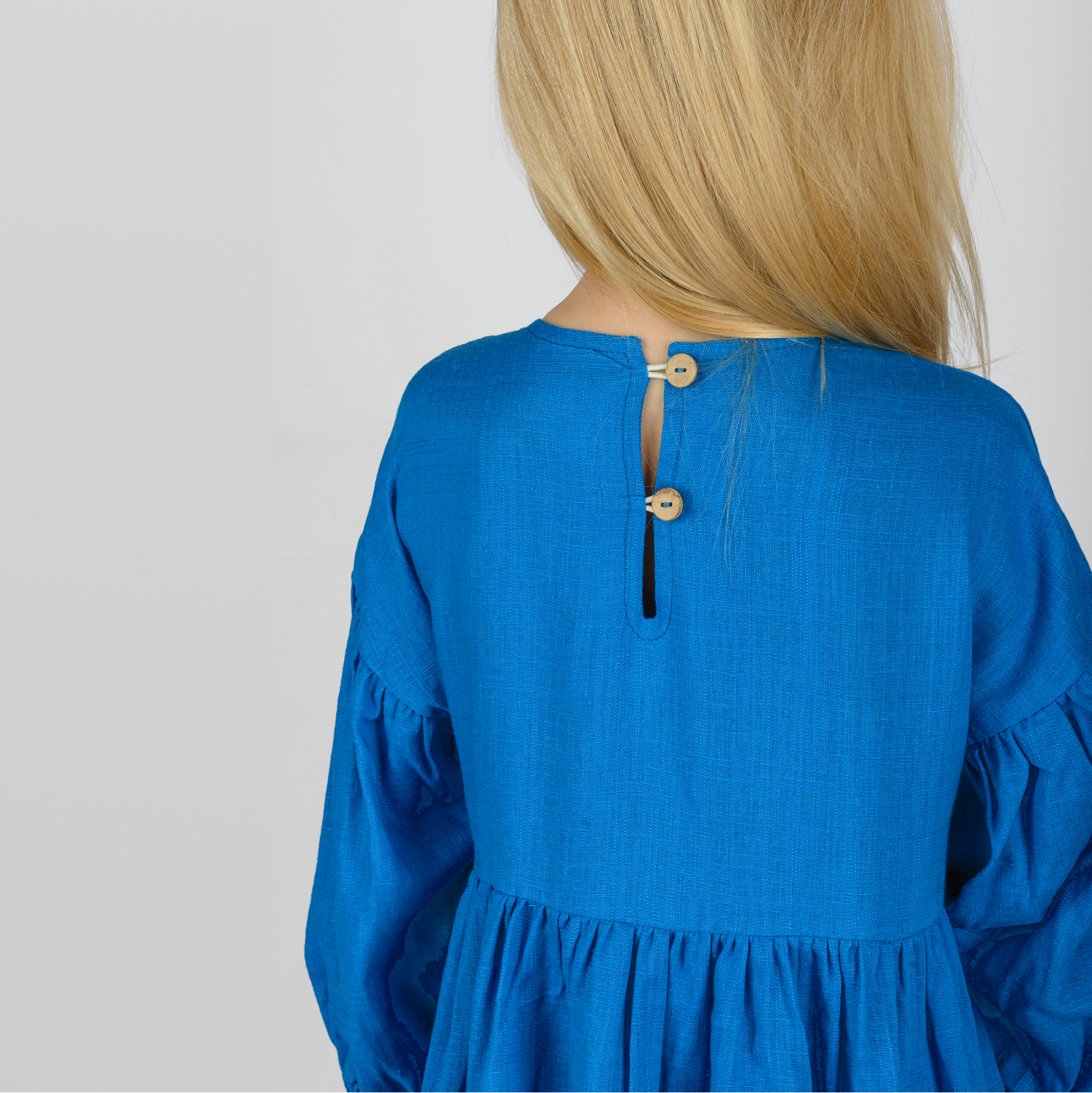 Платье для девочки NÖLEBIRD яркого голубого цвета выполнено из легких, натуральных материалов, что гарантирует удобство в использовании и красивую посадку по фигуре. Силуэт свободный, с завышенной линией талии. Линия плеча спущена, рукав втачной, присборенный, ниже локтя, по низу рукава кулиска с резинкой. Вырез горловины округлый, обработан обтачкой. Юбка платья выполнена из двухъярусных присборенных воланов. Застежка на спине в виде разреза, 2 петли и кокосовые пуговицы. Мягкая ткань лен с вискозой выглядит аккуратно и отличается высокой прочностью. Стирку переносит хорошо, сохраняет внешний вид и форму. Стирать до 40°C, гладить без использования парогенератора при 110°.
